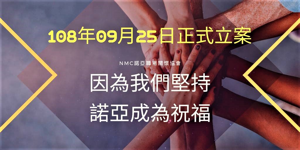 中華民國「諾亞職場關懷協會」於108年09月25日通過內政部正式立案,英文為Noah Marketplace Care Association (NMCA),對外簡稱前三個英文字縮寫「NMC 」,是提供這世代職場朋友分享圓夢的共享平台。我們是一個活潑、喜樂的大家庭,藉著來自不同職場、是一群追求生命成長的伙伴,因著耶穌的愛與恩典,我們學習彼此相愛、相惜,同時也一起經歷上帝的引導、能力與祝福。在這裡,我們專注於職場的學習與生命的成長。因為我們深知上帝如此疼愛每一個人,祂期待你我更加認識祂,因此我們的恩賜相互幫補、成全、造就,在基督裡建立一種真實而深厚的關係,在這樣的關係中,促使我們勇敢在職場上為上帝做那美好的見證。每週一晚上我們固定舉辦「青年創業講座」挑望您職場的熱情、另有「生命音樂河」單元,讓您體驗生命的感動;值得一提的週週都有專業的音樂、詩歌敬拜的呈現,讓您身、心、靈一次滿足。然而,週間時間我們更竭力投入「職場福音團契」、「企業文化關懷」將專業與生活結合,活出信仰的價值、社會企業責任。最後誠摯邀請您,參與我們的團契,讓我們在愛中一起成長,因為再堅強也不要獨自飛翔,甚願我們一起學習,領受上帝豐厚的賜福。